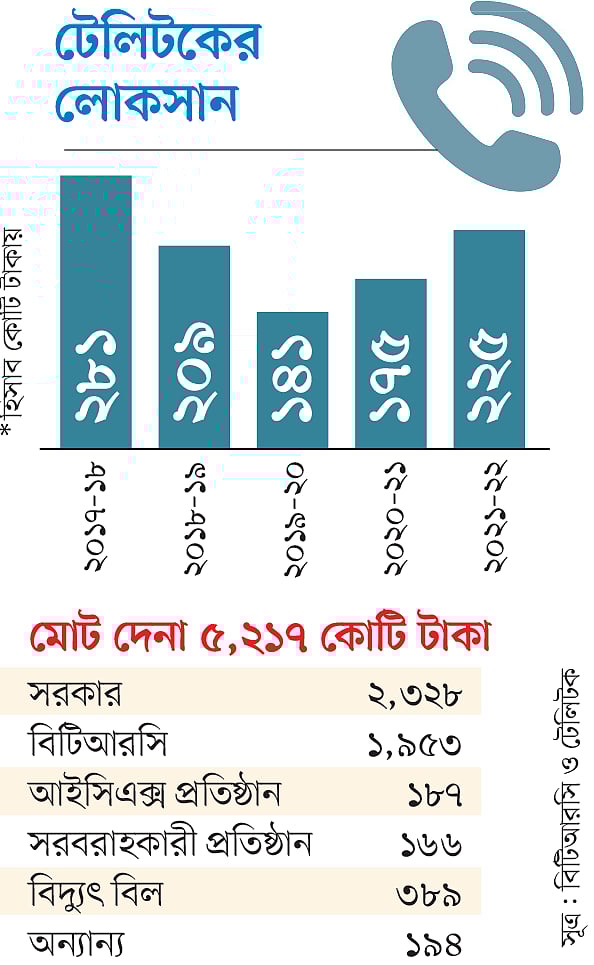 ৫ হাজার ২১৭ কোটি টাকা দেনার বিপরীতে টেলিটকের পাওনা আছে ১৪১ কোটি টাকার মতো।