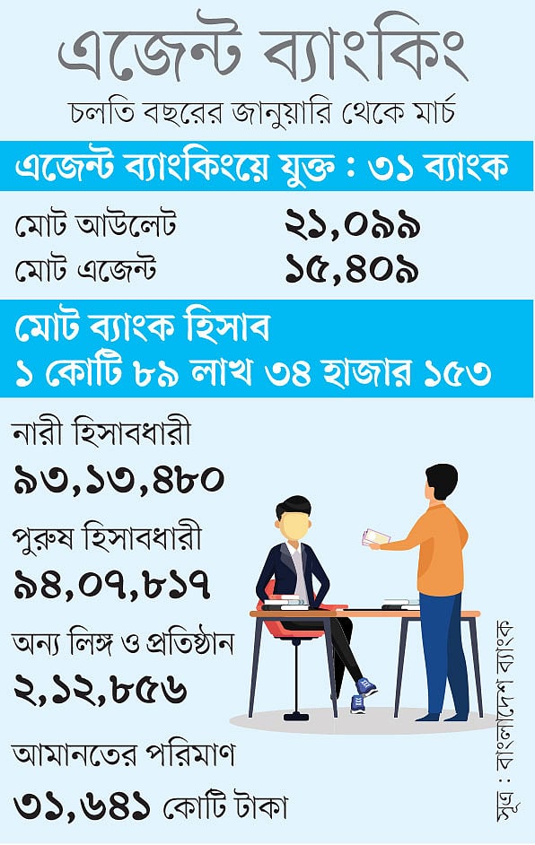 দেশে মোট ৬২টি তফসিলি ব্যাংকের মধ্যে ৩১টি এজেন্ট ব্যাংকিং করছে। সারা দেশে ১৫ হাজার ৪০৯ এজেন্ট ও ২১ হাজার ৯৯ আউটলেট চালাচ্ছেন।