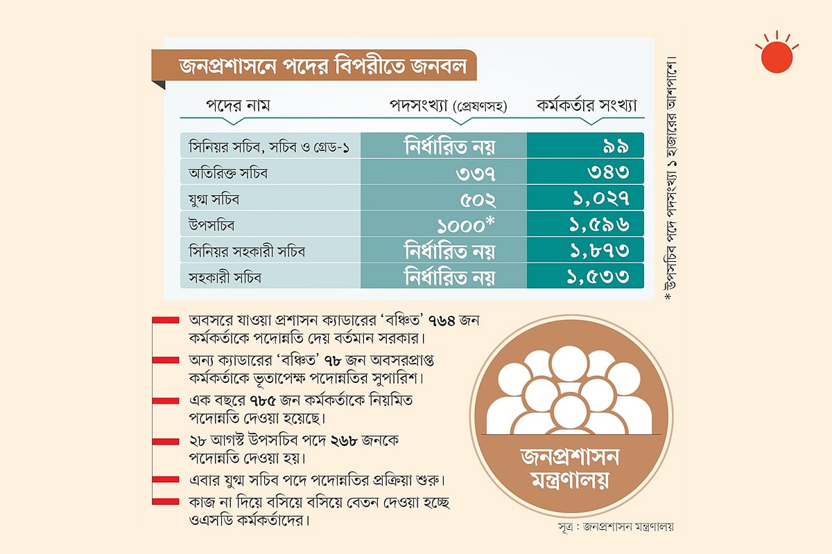 ২০২২ সালের ৩ অক্টোবর প্রথম আলোতে ‘পদ নেই, কাজও আগের, তবু তাঁদের পদোন্নতি’ শিরোনামে একটি প্রতিবেদন প্রকাশিত হয়। এতে পদসংখ্যার বিপরীতে বাড়তি কর্মকর্তা কত, সেই চিত্র তুলে ধরা হয়। তৎকালীন জনপ্রশাসন প্রতিমন্ত্রী ফরহাদ হোসেন অবশ্য পদোন্নতির পক্ষে কিছু যুক্তি তুলে ধরেছিলেন। যুগ্ম সচিব পদে নতুন করে পদোন্নতি দেওয়ার প্রক্রিয়ার কথা জানাতে গিয়ে তিনি প্রথম আলোকে বলেছিলেন, কর্মকর্তারা অবসরে যাওয়ায় প্রতিনিয়তই ওপরের পদগুলোতে জনবল কমতে থাকে। আর যুগ্ম সচিব পদটি বেশি প্রয়োজন। প্রকল্পসহ সরকারের কাজও বেড়েছে। এ জন্য যুগ্ম সচিব পদে অন্তত ১০০ জনের মতো বেশি জনবল রাখতে হয়। কারণ, অনেকে শিক্ষাছুটিতে থাকেন, অসুস্থ থাকেন।