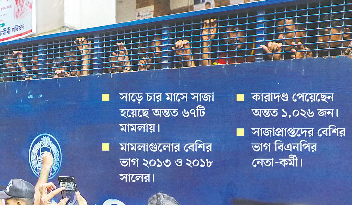 বিগত সাড়ে চার মাসে ঢাকার বিভিন্ন আদালতে এ নিয়ে ৬৭ মামলায় অন্তত ১ হাজার ২৬ নেতা-কর্মীর সাজা হলো। তাঁদের বেশির ভাগ বিএনপি এবং দলটির অঙ্গ ও সহযোগী সংগঠনের নেতা-কর্মী। কিছুসংখ্যক জামায়াতের। দণ্ডিতদের মধ্যে কিছু সংখ্যক নেতা–কর্মী একাধিক মামলায় সাজাপ্রাপ্ত হয়েছেন।