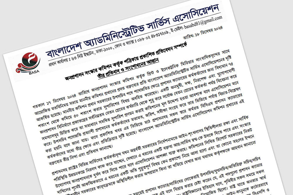অ্যাডমিনিস্ট্রেটিভ সার্ভিস অ্যাসোসিয়েশনের সভাপতি মো. আনোয়ার উল্ল্যাহ ও মহাসচিব মুহাম্মদ মাহবুবুর রহমান এক বিবৃতিতে বলেন, কমিশনের প্রতিবেদন সরকারের কাছে জমা দেওয়ার আগেই আকস্মিকভাবে এ ধরনের একটি অতি গুরুত্বপূর্ণ বিষয় কেন প্রকাশ্য নিয়ে আসা হলো সেই প্রশ্ন তুলেছেন। কোনো মহলের ইন্ধনে অন্তর্বর্তী সরকারের কার্যক্রমকে অস্থিতিশীল করার অপপ্রয়াস কি না, তা খতিয়ে দেখতেও বলছেন তাঁরা।