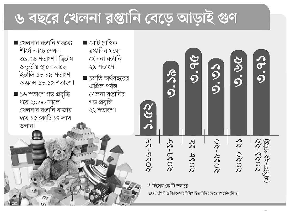 ইপিবির তথ্য বলছে, গত ২০১৬-১৭ অর্থবছরে খেলনা রপ্তানিতে বাংলাদেশের আয় ছিল মাত্র ১ কোটি ৫২ লাখ ডলার। আর চলতি ২০২১-২২ অর্থবছরের প্রথম ১০ মাসে (জুলাই–এপ্রিল) খেলনা রপ্তানিতে আয় হয়েছে ৩ কোটি ৭১ লাখ ডলার, অর্থাৎ গত ছয় বছরে বিশ্ববাজারে খেলনা রপ্তানিতে বাংলাদেশের আয় প্রায় আড়াই গুণ বেড়েছে।