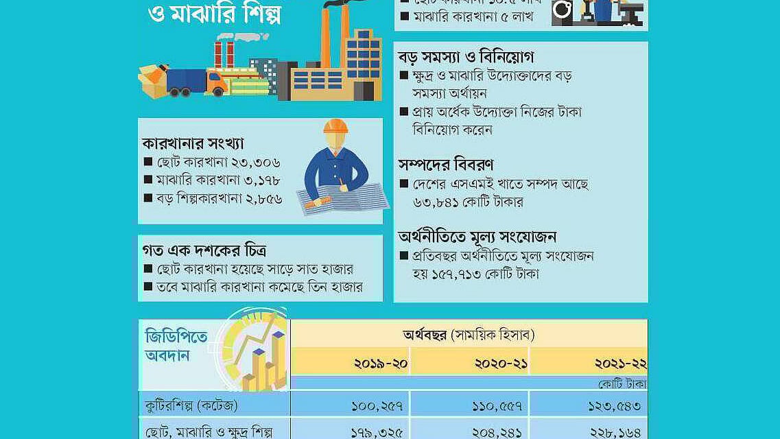 বিবিএস সূত্রে জানা গেছে, বর্তমানে এসএমই খাতে ৬৩ হাজার ৮৪১ কোটি টাকার সম্পদ আছে। আর প্রতিবছর এই খাত থেকে অর্থনীতিতে মূল্য সংযোজন হয় ১ লাখ ৫৭ হাজার ৭১৩ কোটি টাকা। ছোট ও মাঝারি শিল্পোউদ্যোক্তারা দেশের চাহিদা মেটান, আবার বিদেশেও পণ্য রপ্তানি করেন। অন্যদিকে এসএমই কারখানাগুলো বড় শিল্পের সংযোগ শিল্প হিসেবে কাজ করে থাকে।