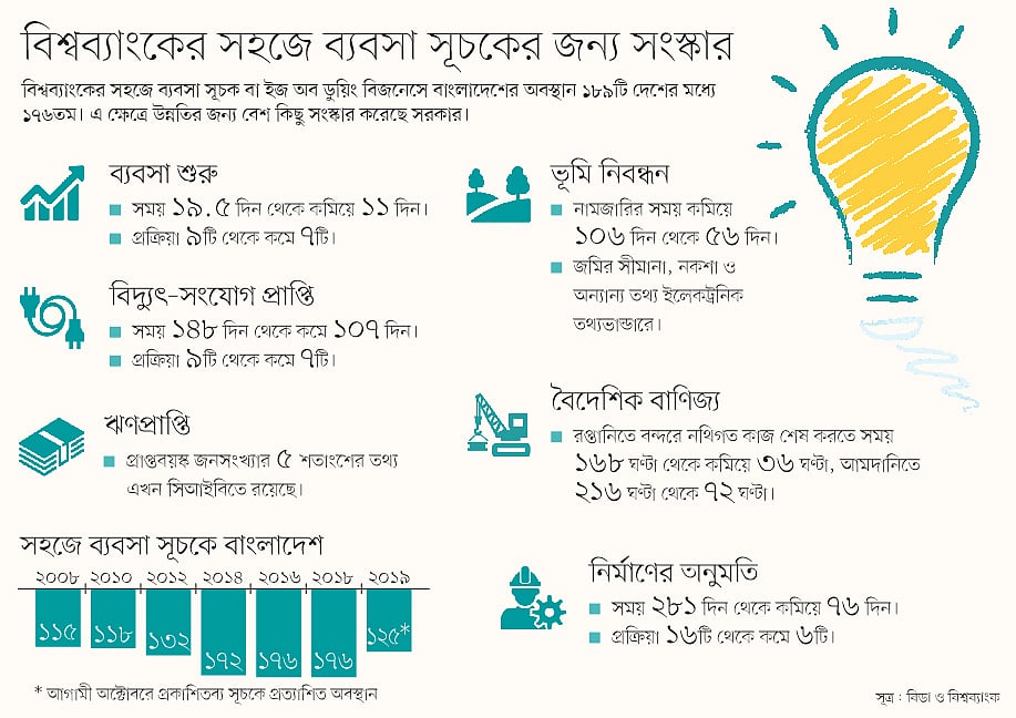 বিশ্বব্যাংকের সহজে ব্যবসা সূচক বা ইজ অব ডুয়িং বিজনেসে এ বছর বড় ধরনের উন্নতির আশা করছে সরকার। বাংলাদেশ বিনিয়োগ উন্নয়ন কর্তৃপক্ষ (বিডা) জানিয়েছে, এ বছর বেশ কিছু সংস্কার করা হয়েছে। আগামী অক্টোবর মাসে বিশ্বব্যাংক যখন সহজে ব্যবসা সূচক প্রকাশ করবে, তখন বাংলাদেশের অবস্থান অনেকটাই এগিয়ে যাবে।