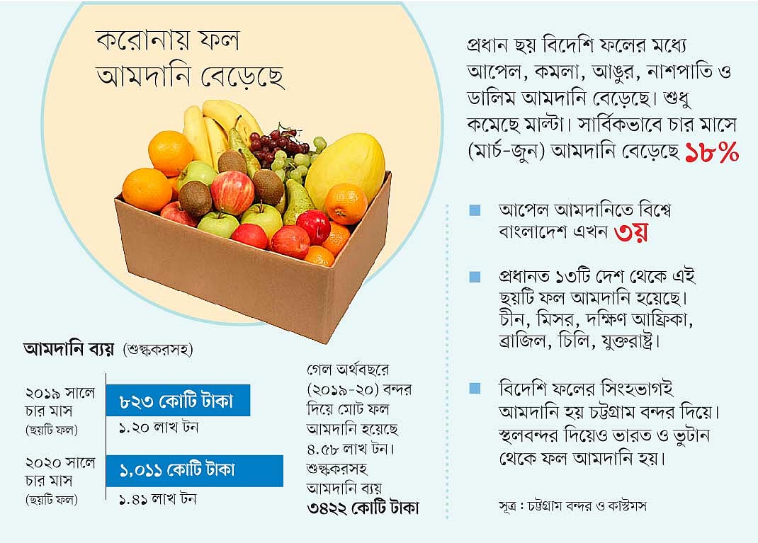 চট্টগ্রাম বন্দর দিয়ে বিদেশি ফলের মধ্যে সবচেয়ে বেশি আমদানি হয় আপেল ও মাল্টা। এ দুটি ফলের পরে আছে কমলা, আঙুর, নাশপাতি ও ডালিম। মার্চ–জুন সময়ে আপেল আমদানি ৪৪ শতাংশ বেড়ে দাঁড়িয়েছে প্রায় ৮০ হাজার টনে। একইভাবে কমলা–আঙুর, নাশপাতি, ডালিম আমদানি ৯২ শতাংশ বেড়ে দাঁড়িয়েছে ৯ হাজার ৯০৭ টনে। অবশ্য করোনার সময়ে বিশ্বে মাল্টার মৌসুম ছিল শেষ দিকে। মৌসুম না থাকায় এ সময় মাল্টা (অরেঞ্জ) আমদানি কিছুটা কমে ৫২ হাজার টনে নেমেছে। মাল্টা কিছুটা কমলেও মোট ফল আমদানির হিসাবে বেড়েছে।
