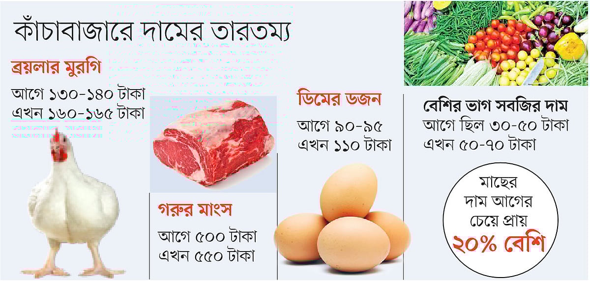 বাজারের সবজি ও মাছ ব্যবসায়ীরা বলছেন, শীতের পর গ্রীষ্মের শুরুতে সবজি ও মাছের দাম একটু বেশি থাকে। এর সঙ্গে যোগ হয়েছে মুরগি, গরুর মাংস ও ডিমের বাড়তি দাম। এ সময়ে মাংস ও ডিমের দাম সাধারণত এত চড়া থাকে না।