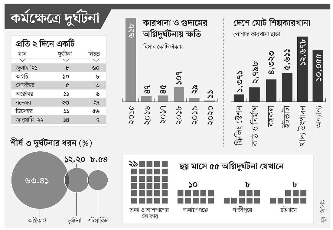 গবেষণা প্রতিবেদন উপস্থাপন করে গোলাম মোয়াজ্জেম বলেন, গত ছয় মাসে শিল্পকারখানায় ৮২টি দুর্ঘটনা ঘটেছে। তাতে ১৬৭ শ্রমিক নিহত ও ২৫৬ জন শ্রমিক আহত হয়েছেন। এর মানে প্রতি দুই দিনে একটি করে দুর্ঘটনা ঘটেছে। শিল্পকারখানায় দুর্ঘটনার মধ্যে সবচেয়ে বেশি হচ্ছে অগ্নিকাণ্ড। ঢাকা ও এর আশপাশে, নারায়ণগঞ্জ, গাজীপুর ও চট্টগ্রামে অগ্নিদুর্ঘটনা বেশি ঘটছে।