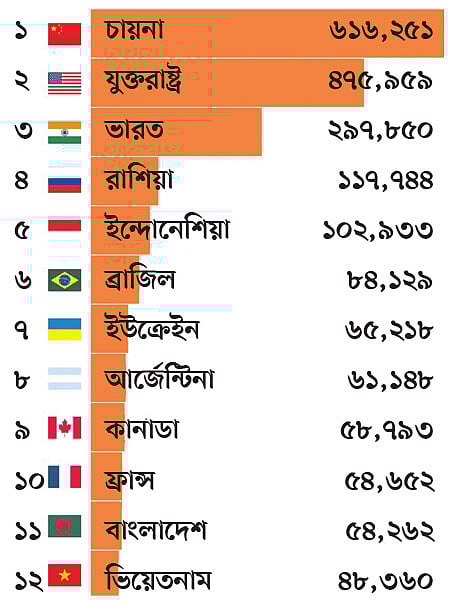 দ্বিতীয় অবস্থানে থাকা যুক্তরাষ্ট্রের মোট উৎপাদন ৪৭ কোটি ৬০ লাখ টন। তৃতীয় স্থানে থাকলেও ভারতের উৎপাদন এর প্রায় অর্ধেক, ২৯ কোটি ৭৮ লাখ টন। রাশিয়ার আরও কম, ১১ কোটি ৭৭ লাখ টন। আর ইন্দোনেশিয়ার ১০ কোটি ৩০ লাখ টন।