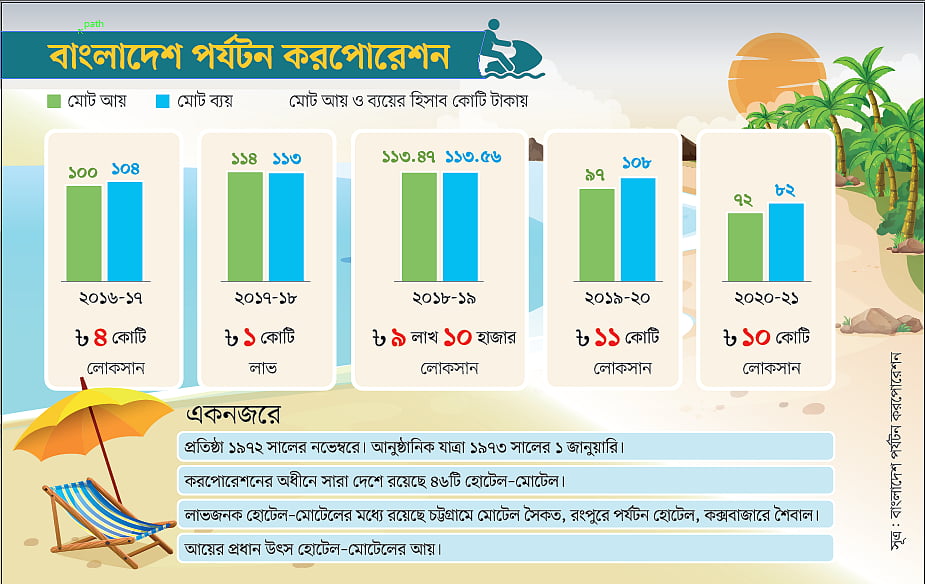 বিশ্বের দীর্ঘতম এই সমুদ্রসৈকতে আসা পর্যটকদের জন্য পর্যটন করপোরেশন সেখানে শৈবাল, প্রবাল ও লাবণী—এসব হোটেল-মোটেল গড়ে তোলে। কিন্তু সেগুলোর কোনোটিরই কোনো দিন আধুনিকায়ন করা হয়নি। সব কটি হোটেল-মোটেলের অবস্থা নাজুক। ফলে কাঙ্ক্ষিত পর্যটক মিলছে না। অথচ অনেক বছর পরে কক্সবাজারে বেসরকারি উদ্যোগে অসংখ্য হোটেল-মোটেল ও রেস্তোরাঁ গড়ে উঠেছে। কক্সবাজারের পর্যটন ব্যবসা এখন পুরোপুরি বেসরকারি খাতের নিয়ন্ত্রণে। অথচ যাদের হাত ধরে কক্সবাজারে হোটেল-মোটেলের গোড়াপত্তন, তাদের অস্তিত্ব এখন হুমকির মুখে।