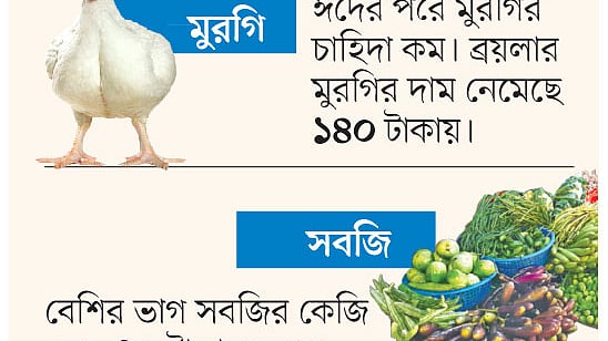 রাজধানীর খুচরা বাজারে মুরগির দামও কমেছে, যা ঈদের আগে বেড়ে গিয়েছিল। তবে বাড়তি পেঁয়াজের দাম। এত দিন দেশি পেঁয়াজের কেজি ৪০ টাকার আশপাশে ছিল। খুচরা দোকানে এখন পেঁয়াজ বিক্রি হচ্ছে ৪৫ টাকা দরে। তবে সবজির দাম তুলনামূলক কম।
