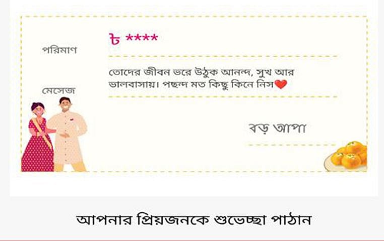 গ্রাহকের আনন্দ বাড়াতে ডিজিটাল আর্থিক লেনদেনে এই উদ্ভাবন এনেছে বিকাশ। প্রিয়জনকে খুশি করতে টাকা উপহার দেওয়ার বহু চর্চিত প্রথাটিকেই ডিজিটাল মাধ্যমে আনা হয়েছে।শামসুদ্দিন হায়দার, হেড অব করপোরেট কমিউনিকেশনস, বিকাশ
