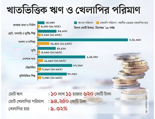 >দেশে খেলাপি ঋণের শতকরা হারে জাহাজ ভাঙা ও নির্মাণ আর পরিমাণের দিক থেকে ব্যবসা ও বাণিজ্য খাত সবার শীর্ষে।