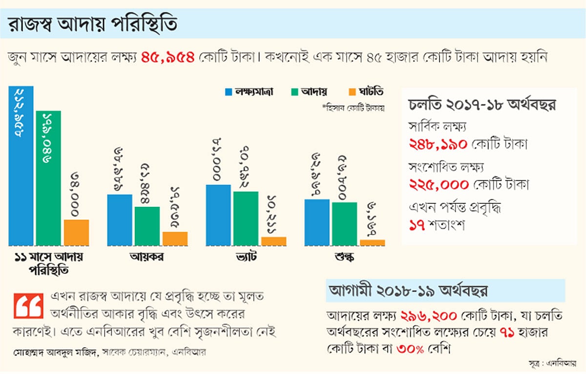 চলতি ২০১৭-১৮ অর্থবছরের শেষ মাস জুনে জাতীয় রাজস্ব বোর্ডকে (এনবিআর) ৪৫ হাজার ৯৫৪ কোটি টাকা আদায় করতে হবে। তা করতে পারলে আলোচ্য অর্থবছরে এনবিআরের ২ লাখ ২৫ হাজার কোটি টাকার রাজস্ব আহরণের সংশোধিত লক্ষ্য অর্জিত হবে।