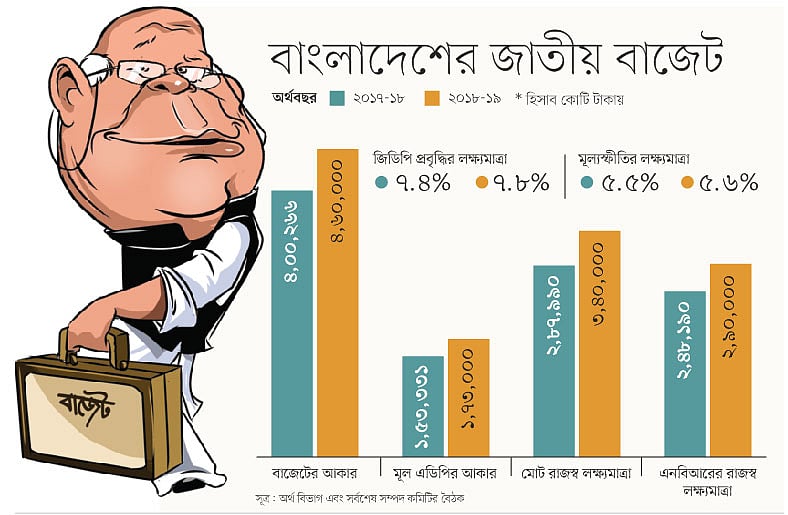 বৈঠক সূত্রে জানা গেছে, আগামী বাজেটে মোট দেশজ উৎপাদনের (জিডিপি) প্রবৃদ্ধির হার ধরা হয়েছে ৭ দশমিক ৮ শতাংশ। চলতি অর্থবছরের জিডিপিতে প্রবৃদ্ধির হার ৭ দশমিক ৪ শতাংশ ধরা হয়েছিল। যদিও বাংলাদেশ পরিসংখ্যান ব্যুরোর (বিবিএস) প্রাথমিক হিসাব বলছে, চলতি অর্থবছরে জিডিপিতে ৭ দশমিক ৬৫ শতাংশ প্রবৃদ্ধি অর্জিত হবে।