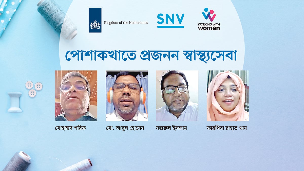 নেদারল্যান্ডস দূতাবাসের আর্থিক সহায়তায় পরিচালিত এসএনভি বাংলাদেশের ওয়ার্কিং উইথ ওমেন প্রকল্প-২ এবং প্রথম আলোর যৌথ উদ্যোগে ‘পোশাকশিল্পে প্রজনন স্বাস্থ্যসেবা’ শিরোনামের আলোচনা সভাটি অনুষ্ঠিত হয়। ছয় পর্বের এ সভার প্রথম পর্বে অংশ নেন পরিবার পরিকল্পনা অধিদপ্তরের পরিচালক (মা ও শিশু) মোহাম্মদ শরীফ, পোশাকশিল্পের মালিকদের সংগঠন বিজিএমইএর পরিচালক নজরুল ইসলাম, এসএনভির আরএমজি ইনক্লুসিভ বিজনেস প্রোগ্রামের টিম লিডার ফারথিবা রাহাত খান এবং আল হেরা হাসপাতালের চিকিৎসক মো. আবুল হোসেন। সভাটি সঞ্চালনা করেন প্রথম আলোর সহযোগী সম্পাদক আব্দুল কাইয়ুম।