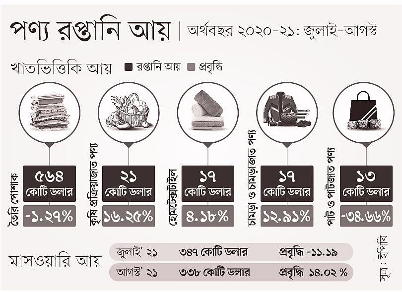 মোট রপ্তানি আয়ের ৮২ শতাংশ পোশাক থেকে এসেছে। আগস্টে রপ্তানি হওয়া ২৭৫ কোটি ডলারের পোশাকের মধ্যে ৫৮ শতাংশ বা ১৬০ কোটি ডলার এসেছে নিট পোশাক থেকে, আর নিটের রপ্তানি বেড়েছে ১৭ শতাংশ। তার বিপরীতে ওভেন পোশাকের রপ্তানি বেড়েছে ৪ দশমিক ৪৮ শতাংশ।