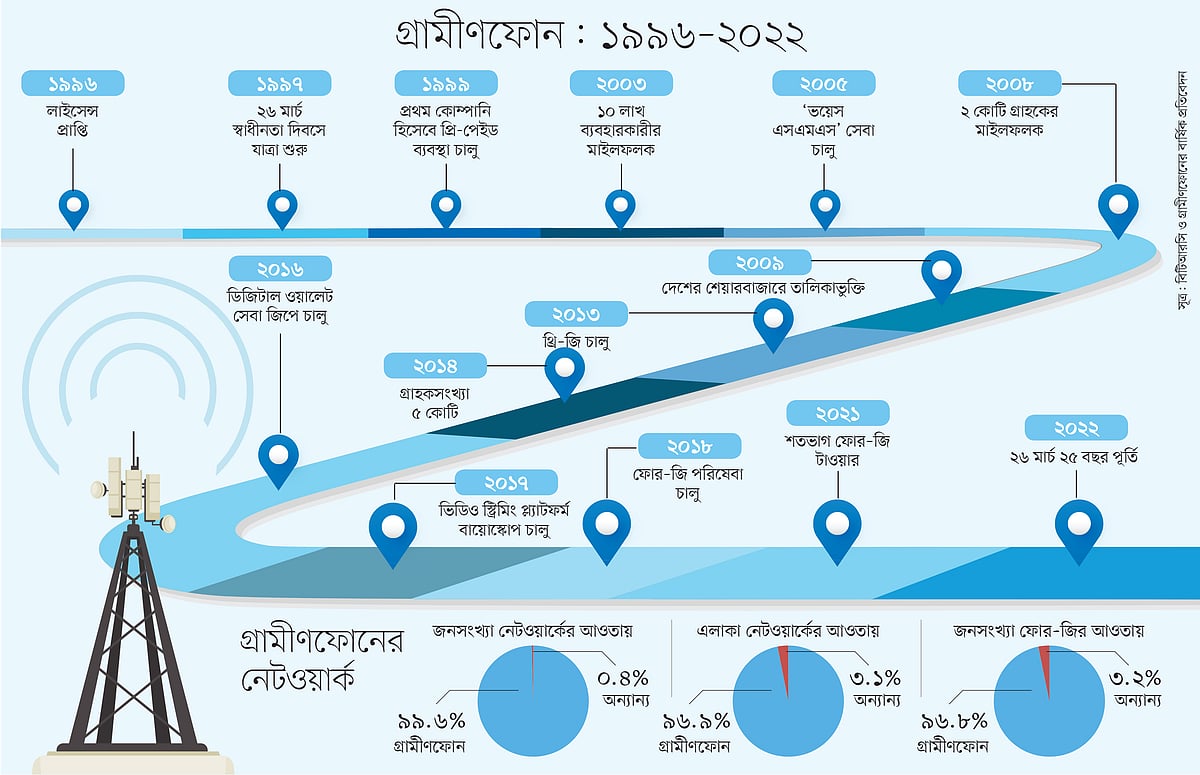 বাংলাদেশের টেলিযোগাযোগ ও সামাজিক এই রূপান্তরের সবচেয়ে বড় সঙ্গী মুঠোফোন অপারেটর গ্রামীণফোন। ১৯৯৭ সালের ২৬ মার্চ যাত্রা শুরু করা গ্রামীণফোন এবং গ্রামীণ ব্যাংকের মাধ্যমে গ্রামে গ্রামে পল্লীফোন সেবা চালু হয়েছিল, যার মাধ্যমেই বিস্তৃতভাবে তৃণমূলে গিয়েছিল টেলিযোগাযোগ সেবা। আজ ২৫ বছর পর গ্রামে গ্রামে পৌঁছে গেছে দ্রুতগতির (ফোর-জি) ইন্টারনেট। মানুষের হাতে হাতে এখন স্মার্টফোন।