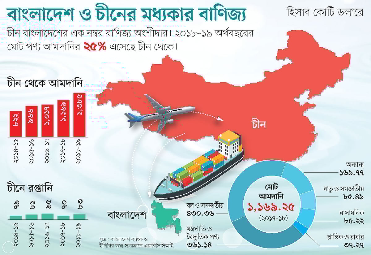 এখানে উল্লেখ করা জরুরি যে বাংলাদেশে শিল্পের কাঁচামাল ও অন্যান্য পণ্যের বড় উৎস চীন। সর্বশেষ ২০১৮-১৯ অর্থবছরে বাংলাদেশ প্রায় ৫ হাজার ৬০৬ কোটি মার্কিন ডলারের পণ্য আমদানি করেছে, যার ২৫ শতাংশ এসেছে চীন থেকে। অবশ্য রপ্তানিতে চীনের বাজার বাংলাদেশের জন্য ততটা বড় নয়। সর্বশেষ অর্থবছরে দেশের মোট রপ্তানি আয়ের ২ শতাংশ এসেছে চীন থেকে।