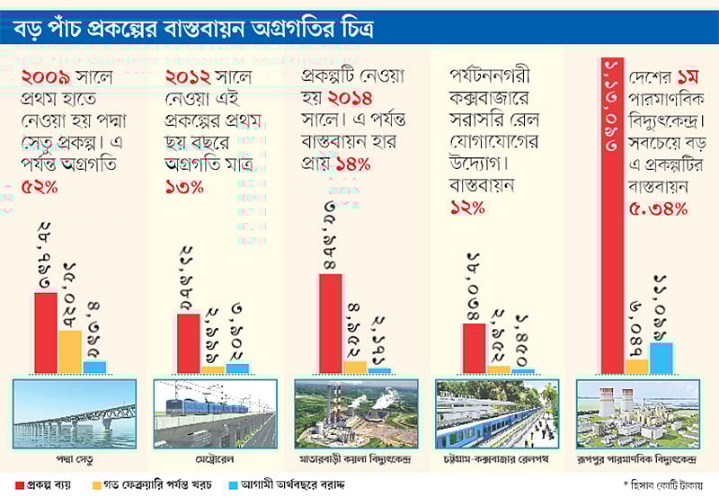 এখন পর্যন্ত পদ্মা সেতুর কাজই সবচেয়ে বেশি দৃশ্যমান। এটির মূল অবকাঠামো তৈরি হচ্ছে। এই প্রকল্পের অর্ধেকের বেশি টাকা খরচ হয়ে গেছে। মেট্রোরেলের মূল কাঠামো তৈরির কাজ চলছে। রূপপুর পারমাণবিক বিদ্যুৎ, পদ্মা সেতু রেলসংযোগ, মাতারবাড়ী কয়লাবিদ্যুৎ কেন্দ্র, চট্টগ্রাম-কক্সবাজার রেলপথ—এসব বড় প্রকল্পের কাজ ১৫ শতাংশও এগোয়নি। আবার অন্য কয়েকটির মূল কাজই এখনো শুরু হয়নি।