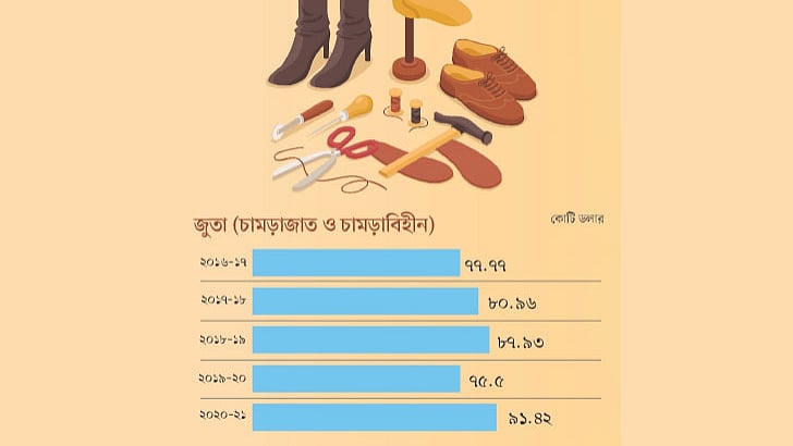 রপ্তানি উন্নয়ন ব্যুরোর (ইপিবি) পাঁচ অর্থবছরের পরিসংখ্যানে দেখা যায়, ২০১৬-১৭ অর্থবছরে রপ্তানি হয়েছিল ৭৮ কোটি ডলারের চামড়াজাত ও চামড়াবিহীন জুতা। পরেরবার ৮১ কোটি এবং তারপরের বার ৮৮ কোটি ডলারের রপ্তানি হলেও ২০১৯-২০ অর্থবছরে এক ধাক্কায় তা নেমে আসে ৭৬ কোটি ডলারে। কেন্দ্রীয় ব্যাংকের তথ্য অনুযায়ী, প্রতিবছর যা রপ্তানি হয়, তার মধ্যে চামড়ার তৈরি জুতাই ৮৫ শতাংশের মতো। বাকিটা সিনথেটিকসহ অন্যান্য পণ্যের।