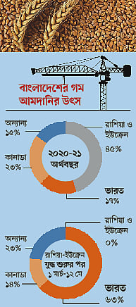 রাশিয়া ও ইউক্রেনের মধ্যে যুদ্ধ শুরুর পর বাংলাদেশে গম আমদানির সবচেয়ে বড় উৎস হয়ে উঠেছিল ভারত। দেশটি গত শুক্রবার গম রপ্তানি বন্ধ ঘোষণা করে। এতে বাংলাদেশের বাজারে গমের দাম বেড়ে গেছে, যা আগে থেকেই বেশ চড়া ছিল।