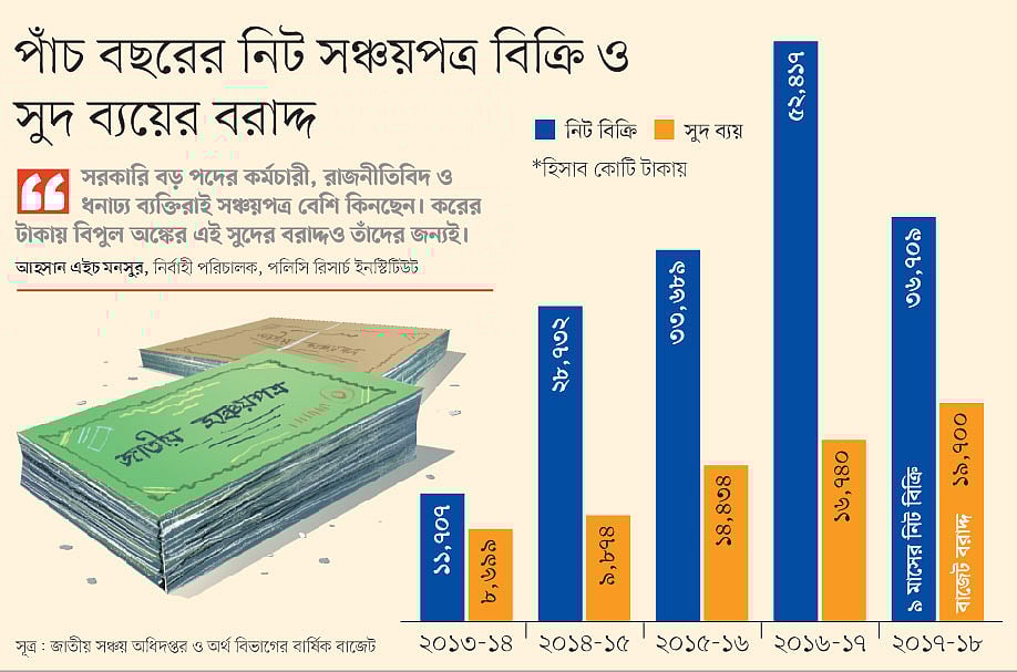 কিন্তু কাদের কাছে বিক্রি হচ্ছে সঞ্চয়পত্র? তাঁদের বেশির ভাগ কি সাধারণ মানুষ? এমন প্রশ্নের জবাবে বেসরকারি গবেষণা সংস্থা পলিসি রিসার্চ ইনস্টিটিউটের (পিআরআই) নির্বাহী পরিচালক আহসান এইচ মনসুর বলেন, ‘না। সরকারি বড় পদের কর্মচারী, রাজনীতিবিদ ও ধনাঢ্য ব্যক্তিরাই সঞ্চয়পত্র বেশি কিনছেন। করের টাকায় বিপুল অঙ্কের এই সুদের বরাদ্দও তাঁদের জন্যই।’