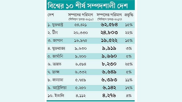 এই প্রতিবেদন অনুসারে মার্কিন যুক্তরাষ্ট্র বিশ্বের সবচেয়ে সম্পদশালী দেশ, যার মোট সম্পদের পরিমাণ ৬২ হাজার ৫৮৪ বিলিয়ন ডলার। ২৪ হাজার ৮০৩ বিলিয়ন ডলার নিয়ে চীন দ্বিতীয় ও ১৯ হাজার ৫২২ বিলিয়ন ডলার নিয়ে জাপান এই তালিকায় তৃতীয় স্থানে আছে। দেশের নাগরিকদের ব্যক্তিগত সম্পদ, নগদ টাকা, ইকুইটি, ব্যবসায়িক স্বার্থ—এসব যোগ করে সম্পদ নির্ধারণ করা হয়। তবে দায়দেনা বাদ দিয়ে এই সম্পদ পরিমাপ করা হয়। তার সঙ্গে সরকারি তহবিলও হিসাব করা হয় না। ব্যক্তির সম্পদ পরিমাপ করে এই হিসাব করা হয় বলে বড় দেশগুলো এই তালিকায় ওপরের দিকে আছে।