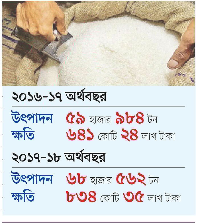 সংশ্লিষ্ট সূত্র জানায়, ২০১২–১৩ অর্থবছরে কেরুর লাভ হিসাবে নিয়ে চিনিকলগুলোর লোকসান ছিল ৩১৪ কোটি টাকা। ২০১৬–১৭ অর্থবছরে সেটি দাঁড়ায় ৬৪১ কোটি টাকায়। আর গত অর্থবছরে লোকসান ৮৩৪ কোটি টাকা। এই ১৫ চিনিকলের উৎপাদন ক্ষমতা বছরে প্রায় ২ লাখ ১০ টন। কিন্তু গত ছয় বছরের হিসাবে তাদের সর্বোচ্চ উৎপাদন ছিল ১ লাখ ২৮ হাজার ২৬৮ টন। গত বছর ছিল ৬৮ হাজার ৫৬২ টন। এ বছর এখন পর্যন্ত উৎপাদিত হয়েছে ৬৮ হাজার ৯৫২ টন। চিনি উৎপাদন করা মূল কাজ হলেও প্রতিষ্ঠানটি ২০১৭ সালে ৫০০ কোটি টাকা ঋণ নিয়ে চিনি আমদানি করে। সে চিনি এখনো পড়ে আছে গুদামে।