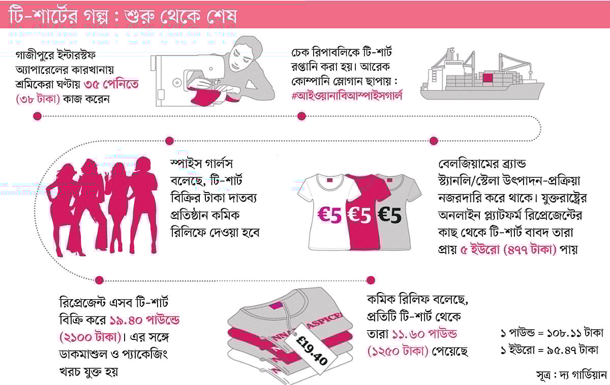 গার্ডিয়ান গত রোববার ‘স্পাইস গার্লস টি-শার্ট মেড ইন ফ্যাক্টরি পেয়িং স্টাফ ৩৫ পেনি অ্যান আওয়ার’ শীর্ষক প্রতিবেদনটি প্রকাশ করে। গার্ডিয়ান-এর প্রতিবেদক সাইমন মারফি বাংলাদেশের গাজীপুর থেকে এই প্রতিবেদন লিখেছেন। প্রতিবেদনে বলা হয়, কমিক রিলিফ ‘লৈঙ্গিক সমতা’ শীর্ষক প্রচারণার জন্য #আইওয়ানাবিআস্পাইসগার্ল লেখাসংবলিত টি-শার্টগুলো তৈরি করিয়েছে। ১৯ পাউন্ড ৪০ পেনিতে (২,১০০ টাকা) এই টি-শার্ট বিক্রি হবে, যার মধ্যে ১১ পাউন্ড ৬০ পেনি (১,২৫০ টাকা) যাবে দাতব্য প্রতিষ্ঠানটির তহবিলে।