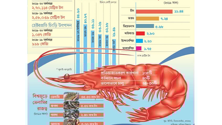 মৎস্য অধিদপ্তরের তথ্যানুযায়ী, দেশে গত ২০১৯-২০ অর্থবছরে ২ লাখ ৭০ হাজার ১৪ মেট্রিক টন চিংড়ি উৎপাদন হয়। তার আগের বছর উৎপাদন হয়েছিল ২ লাখ ৫৮ হাজার ৩৯ মেট্রিক টন। ওই দুই বছর হেক্টরপ্রতি চিংড়ি উৎপাদন হয় যথাক্রমে ৯৯৮ কেজি ও ১ হাজার ৪৭ কেজি।