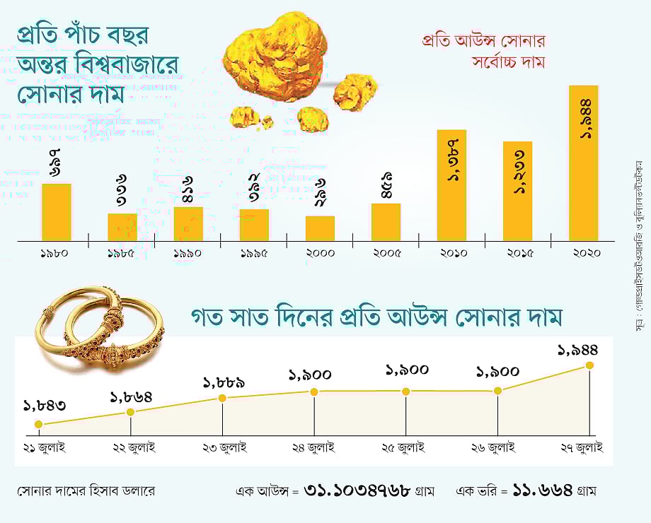 সোনার দাম কয়েক মাস ধরেই বাড়ছিল। তা দেখে বিশ্লেষকেরা বলে আসছিলেন, এ বছরেই সোনার আউন্সপ্রতি দাম বেড়ে ২ হাজার ডলারে উঠবে। কিন্তু চলতি জুলাই মাসে এসে পণ্যটির দাম লাফিয়ে লাফিয়ে বাড়তে থাকে। দুই–তিন দিন আগে পূর্বাভাস দেওয়া হয়, চলতি সপ্তাহে সোনার দাম অতীতের সব রেকর্ড ভেঙে ফেলবে। কিন্তু সপ্তাহের প্রথম কর্মদিবসেই সোনার দাম বেড়ে আউন্সপ্রতি ১ হাজার ৯৪৪ দশমিক ৭১ পয়েন্টে উঠে ইতিহাসের সর্বোচ্চ পর্যায়ে উন্নীত হয়।