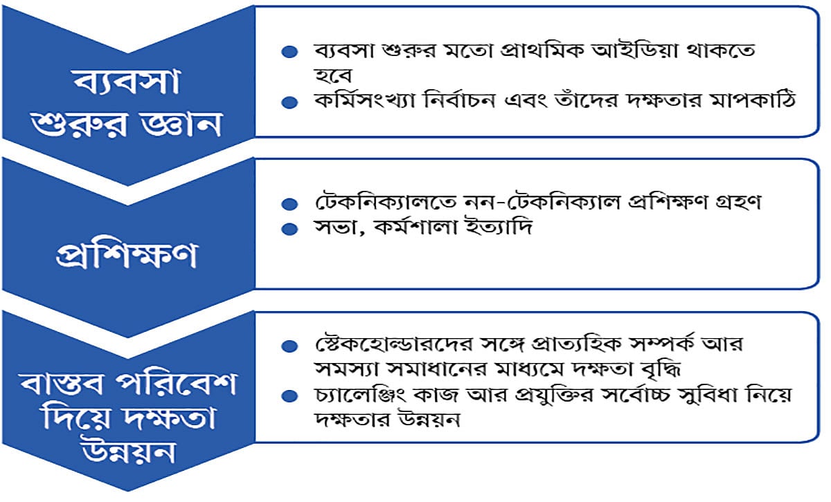 একজন উদ্যোক্তা হিসেবে নিজে কী করতে চাই, সেটা বুঝতে পারা খুব জরুরি। কেননা এর ওপর ভিত্তি করেই তিনি নিজের দক্ষতার উন্নয়ন ঘটাবেন। ব্যবসায় সফল হওয়ার জন্য এই দক্ষতার জায়গাটা খুব বেশি গুরুত্বপূর্ণ। একজন উদ্যোক্তা অনেক মানুষের কর্মসংস্থান করে থাকেন। সেই কর্মীদের দক্ষতার উন্নয়নের গুরুভার একজন উদ্যোক্তার কাঁধেই বর্তায়। তাই সফল হওয়ার জন্য একজন নারীর প্রতিনিয়ত নিজের দক্ষতা উন্নয়নে কাজ করতে হয়। ব্যবসার ধরন অনুযায়ী বিভিন্ন টেকনিক্যাল ও নন-টেকনিক্যাল প্রশিক্ষণ নিতে হয়। তা না হলে প্রতিযোগিতাপূর্ণ পরিবেশে টিকে থাকা অসম্ভব।