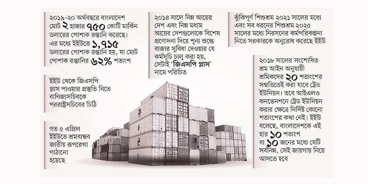 সেগুলো অবশ্য পরের বিষয়। এখন ইইউ থেকে বিদ্যমান শুল্কমুক্ত বাণিজ্য সুবিধা পাওয়া নিয়েই চিন্তা করতে হচ্ছে বাংলাদেশকে। কারণ, বিদ্যমান সুবিধা বহাল রাখতে দেড় বছর আগে থেকে বাংলাদেশের শ্রমবান্ধব আইনের জাতীয় রূপরেখা চেয়ে আসছে ইউরোপের ২৭ দেশের জোট ইইউ। গত মাসে তৃতীয়বারের মতো ইইউতে সেই রূপরেখা পাঠিয়েছে শ্রম ও কর্মসংস্থান মন্ত্রণালয়। এর আগে দুই দফায় রূপরেখা পাঠানো হলেও তা ‘অসম্পূর্ণ’ বলে ফেরত পাঠিয়েছে ইইউ। তৃতীয় নতুন রূপরেখাটিও অসম্পূর্ণ বলে জানা গেছে। মূলত শ্রম ও কর্মসংস্থান, বাণিজ্য এবং পররাষ্ট্র—এই তিন মন্ত্রণালয় মিলে রূপরেখাটি করেছে। এখন ওই রূপরেখার ওপর ইইউর মতামত পাওয়ার অপেক্ষা।