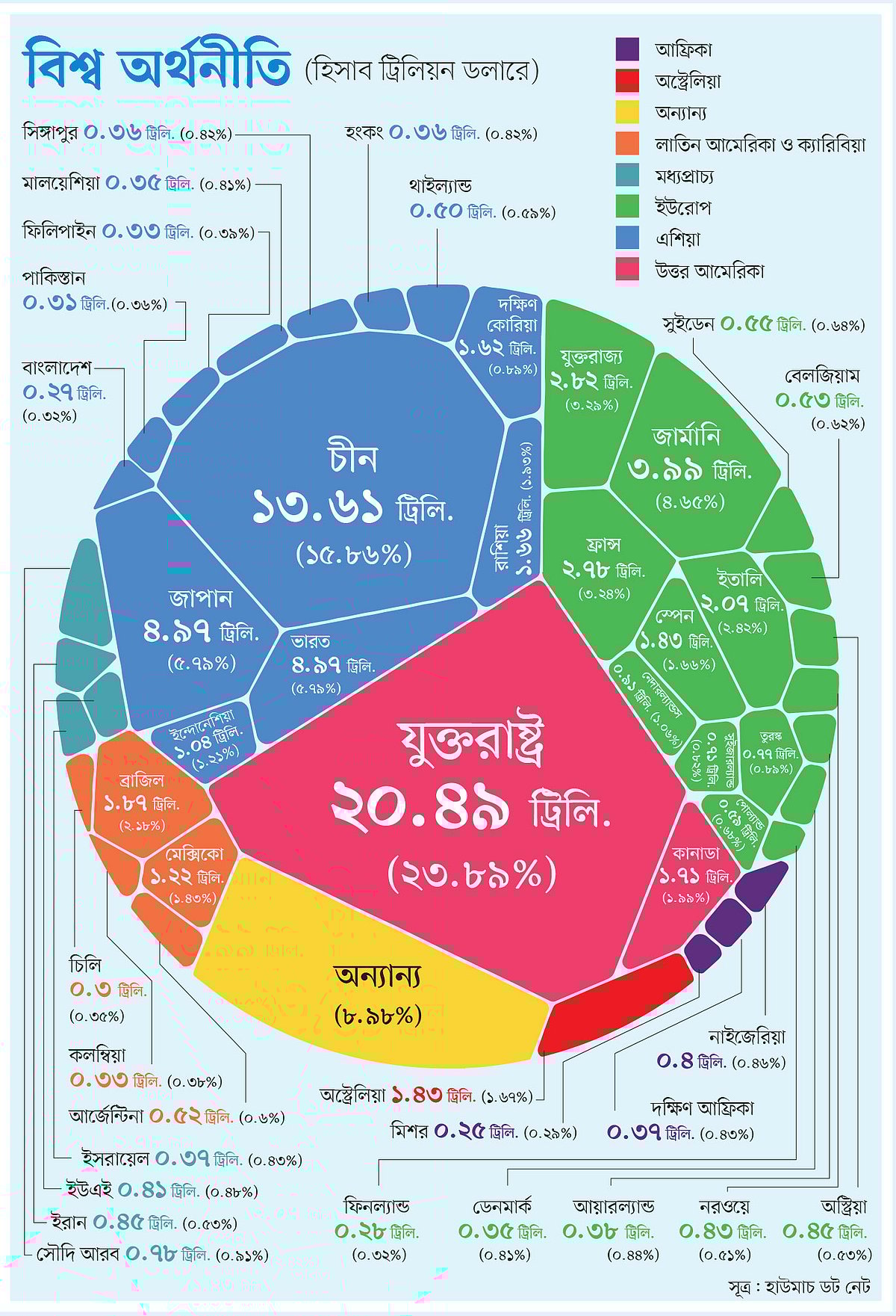 বিশ্ব অর্থনীতি এখন ৮৬ ট্রিলিয়ন ডলারের। এক ট্রিলিয়ন হচ্ছে ১ হাজার বিলিয়ন। আর এক বিলিয়ন ১০০ কোটি। এখন একটা চার্টে পুরো পৃথিবীর অর্থনীতি নিয়ে এলে কেমন দেখাবে? বিশ্বব্যাংকের ২০১৯ সালের জুলাই মাসের উপাত্ত ধরে হিসাবটি করা হয়েছে। বিশ্ব অর্থনৈতিক ফোরাম (ডব্লিউইএফ) হাউমাচডটনেট থেকে নিয়ে এটি তা প্রকাশ করেছে। মোট দেশজ উৎপাদন (জিডিপি) ধরে এই হিসাব তৈরি।