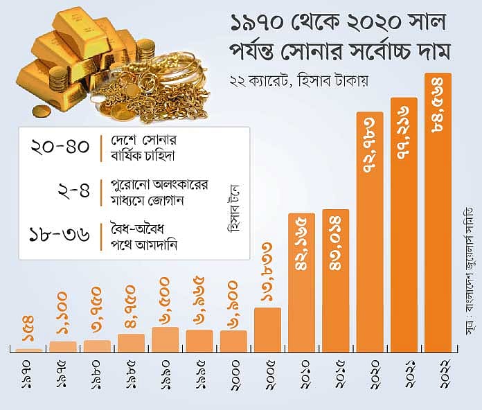 আবার গয়না বানানো ছাড়া দেশের সোনার তেমন কোনো চাহিদাও নেই। অন্যান্য দেশের মতো সোনায় বিনিয়োগ করার মতো কোনো বন্ড বা আর্থিক উপাদানও গড়ে ওঠেনি। ফলে গয়না বানানো বা সোনার বার কিনে রাখাই এখন একমাত্র বিনিয়োগ। অথচ সোনায় বিনিময়যোগ্য আর্থিক কোনো উপাদান থাকলে তাতে দেশই লাভবান হতে পারত, যা পাশের দেশ ভারতেও রয়েছে।