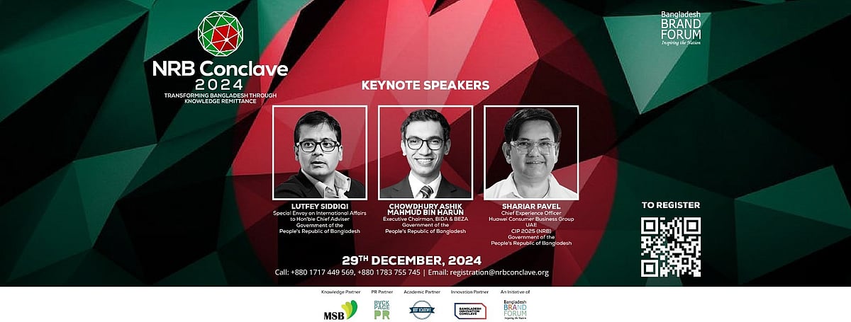 পররাষ্ট্র মন্ত্রণালয়ের সহযোগিতায় বাংলাদেশ ব্র্যান্ড ফোরাম আগামী রবিবার, ২৯ ডিসেম্বর, ২০২৪ তারিখে ঢাকার ফরেন সার্ভিস একাডেমিতে এনআরবি কনক্লেভ ২০২৪ শীর্ষক সম্মেলনের আয়োজন করেছে। ‘ট্রান্সফরমিং বাংলাদেশ থ্রু নলেজ রেমিট্যান্স’ থিমের অধীনে এই সম্মেলন হবে। লক্ষ্য, প্রবাসী বাংলাদেশিদের (এনআরবি) জাতীয় উন্নয়ন ও প্রবৃদ্ধির সহায়ক ভূমিকায় নিয়ে আসার লক্ষ্যে প্রক্রিয়া ও কাঠামো প্রতিষ্ঠা করা।