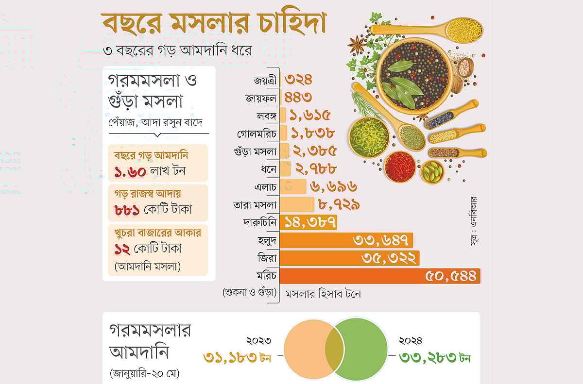 চলতি বছরের জানুয়ারি থেকে ২০ মে পর্যন্ত আদা, রসুন ও পেঁয়াজ ছাড়া সব ধরনের মসলা আমদানি হয়েছে ৭৬ হাজার ১৫৬ টন। ২০২৩ সালের একই সময়ে আমদানি হয়েছিল ৮৮ হাজার ৬২৩ টন। সার্বিকভাবে মসলার আমদানি কমেছে ১৪ শতাংশ। এর মধ্যে এলাচি, দারুচিনি, লবঙ্গ, গোলমরিচ, জায়ফল, জয়ত্রী, জিরা, ধনে ও মসলার গুঁড়ার মোট আমদানি বেড়েছে। এসব মসলা গত বছরের জানুয়ারি থেকে ২০ মে পর্যন্ত আমদানি হয়েছে ৩১ হাজার ১৮৩ টন। এ বছর একই সময়ে আমদানি হয়েছে ৩৩ হাজার ২৮৩ টন। তবে একক পণ্য হিসেবে কিছু মসলার আমদানি কমেছে, কিছু মসলার আমদানি বেড়েছে।