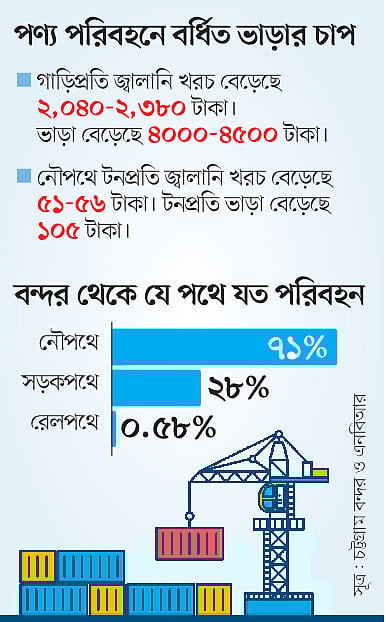 সমুদ্র, স্থলবন্দর ও আকাশপথ—এই তিন পথে মোট পণ্য আমদানির ৭৩ শতাংশই হয়ে থাকে চট্টগ্রাম বন্দর দিয়ে। এই পণ্য চট্টগ্রাম থেকে ঢাকাসহ দেশের বিভিন্ন গন্তব্যে নৌ ও সড়কপথে সবচেয়ে বেশি পরিবহন হয়। জ্বালানির মূল্যবৃদ্ধির সুযোগে পরিবহন কোম্পানিগুলো প্রায় দ্বিগুণ ভাড়া আদায় করায় বিপাকে পড়েছেন ব্যবসায়ীরা। তবে শেষ পর্যন্ত অতিরিক্ত ভাড়ার বোঝা পড়ছে সাধারণ ভোক্তাদের ঘাড়ে।