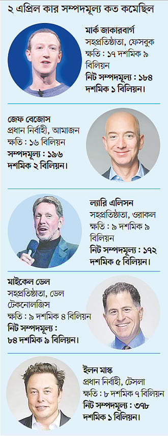 ২ এপ্রিল মার্কিন প্রেসিডেন্ট ডোনাল্ড ট্রাম্প বিশ্বের প্রায় সব দেশের পণ্য আমদানিতে রেসিপ্রোকাল ট্যারিফ বা পাল্টা শুল্ক আরোপ করেন। এতে স্বাভাবিকভাবেই বিশ্বে তোলপাড় শুরু হয়। সেদিন বিশ্বের প্রায় সব দেশে শেয়ারের দাম পড়ে যায়। শেয়ার সূচকের বড় পতন হয়। সেই ধাক্কায় বিশ্বের শীর্ষ বিলিয়নিয়ার বা শতকোটিপতিদের অনেকেরই সম্পদের মূল্য কমে যায়। কারণ, শেয়ারবাজারের অনেক বড় কোম্পানিই তো এসব অতিধনীর। তবে শুল্কের ধকল কাটিয়ে পরে তাঁদের সম্পদমূল্য আবার বৃদ্ধি পায়। খবর ফোর্বস ম্যাগাজিনের।