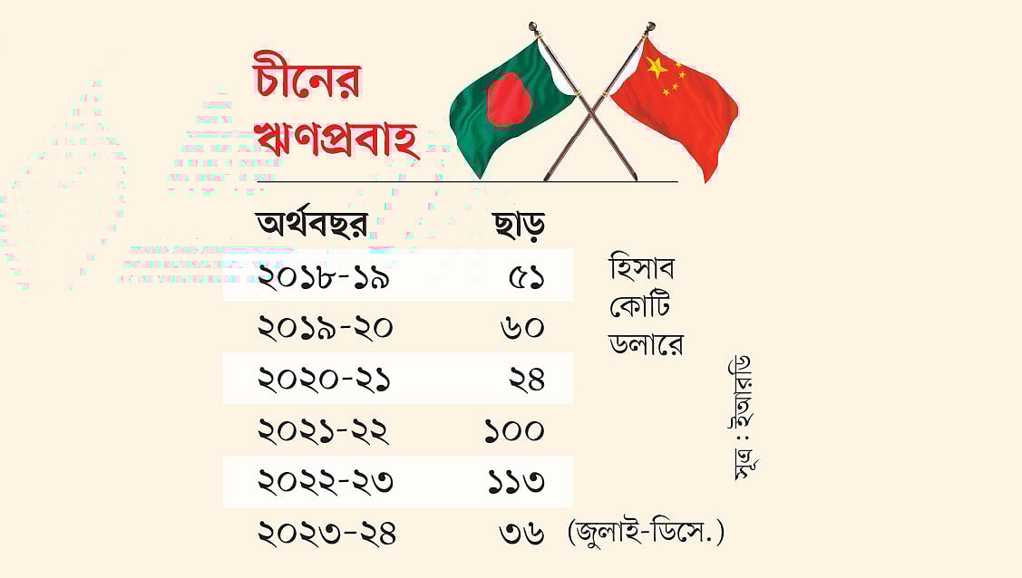 ইতিমধ্যে বাংলাদেশের শীর্ষ ঋণদাতাদের তালিকায় ঢুকে গেছে চীন। বাংলাদেশকে ঋণ দেয়, এমন ৩২টি দেশ ও সংস্থার মধ্যে চীনের অবস্থান এখন চতুর্থ। চীনের ওপরে আছে শুধু জাপান, বিশ্বব্যাংক ও এশীয় উন্নয়ন ব্যাংক (এডিবি)।