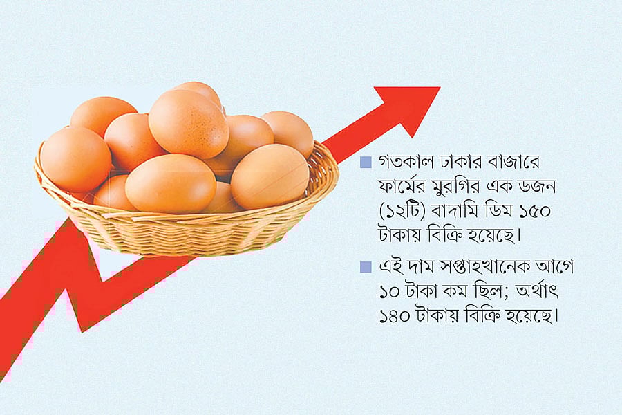 বাজার ঘুরে দেখা যায়, গতকাল ঢাকার বাজারে ফার্মের মুরগির এক ডজন (১২টি) বাদামি ডিম ১৫০ টাকায় বিক্রি হয়েছে। এই দাম সপ্তাহখানেক আগে ১০ টাকা কম ছিল; অর্থাৎ ১৪০ টাকায় বিক্রি হয়েছে। অবশ্য ফার্মের মুরগির সাদা ডিমের দাম ডজনে ৫ টাকা কম রয়েছে। অবশ্য বাজারে মুরগি আগের দরেই রয়েছে। গতকাল বাজারে এক কেজি ব্রয়লার মুরগি ১৮০ থেকে ১৯০ টাকা ও সোনালি মুরগি ২৮০ থেকে ৩০০ টাকা কেজি বিক্রি হয়েছে।
