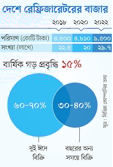 ফ্রিজ উৎপাদন ও বাজারজাতের সঙ্গে যুক্ত প্রতিষ্ঠানের কর্তাব্যক্তিরা জানান, বছরে মোট ফ্রিজ বিক্রির ৬০ থেকে ৭০ শতাংশ হয় দুই ঈদের মৌসুমে।