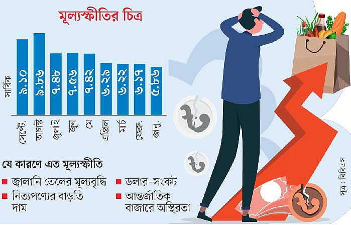 মূলত তিন-চারটি কারণে মূল্যস্ফীতি বাড়ছে। আগস্ট মাসে অকটেন, পেট্রল, ডিজেলসহ সব ধরনের জ্বালানি তেলের দাম বাড়ানো হয়। ফলে ভোগ্য ও শিল্পপণ্যের উৎপাদন খরচ বেড়ে যায়। আবার পরিবহন খরচও বেড়েছে। জ্বালানি তেলের মূল্যবৃদ্ধির প্রভাব পড়েছে প্রায় প্রতিটি ক্ষেত্রে। এ ছাড়া কয়েক মাস ধরেই ডলারের দাম অস্বাভাবিকভাবে বাড়তে শুরু করে। প্রতি ডলারের দাম ৮৬ থেকে বেড়ে ১০০ টাকার ওপরে উঠেছে। ফলে পণ্যের আমদানি খরচ বেড়েছে। এ ছাড়া ইউক্রেন-রাশিয়া যুদ্ধের কারণে আন্তর্জাতিক বাজারে জ্বালানি তেল, ভোজ্যতেলসহ বিভিন্ন নিত্যপণ্যের দাম বেড়েছে।