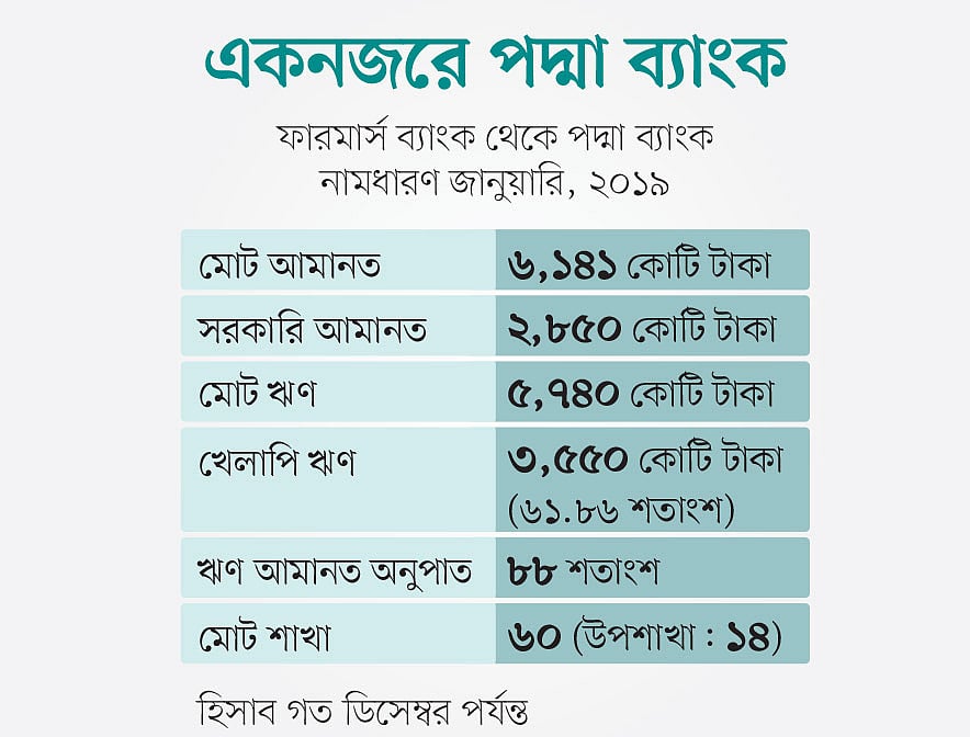 ২০১৩ সালে অনুমোদন পাওয়ার চার বছর না পেরোতেই সংকটে পড়ে ব্যাংকটি। পরিস্থিতির চরম অবনতি হওয়ায় ২০১৭ সালে পদ ছাড়তে বাধ্য হন ব্যাংকটির চেয়ারম্যান ও সাবেক স্বরাষ্ট্রমন্ত্রী মহীউদ্দীন খান আলমগীর। ব্যাংকটির এমডি এ কে এম শামীমকেও অপসারণ করে বাংলাদেশ ব্যাংক। তখন এই ব্যাংককে বাঁচাতে মূলধন সহায়তা দেয় সরকারি চার ব্যাংক ও আইসিবি। সেই সুবাদে ব্যাংকটির পরিচালনায় যুক্ত হন ওই চার ব্যাংক ও আইসিবির প্রতিনিধিরা। ২০১৯ সালের ২৯ জানুয়ারি থেকে দি ফারমার্স ব্যাংকের নাম বদলে রাখা হয় পদ্মা ব্যাংক।