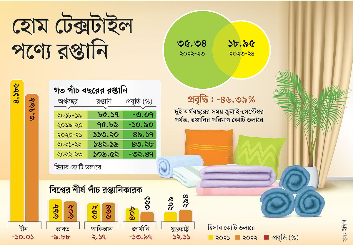 দীর্ঘদিন ধরেই তৈরি পোশাকের পর চামড়া অথবা পাটপণ্যই ছিল দেশের শীর্ষস্থানীয় রপ্তানি খাত। করোনার পরপর ২০২১-২২ অর্থবছরে এই দুটি খাতকে পেছনে ফেলে দ্বিতীয় শীর্ষ রপ্তানি খাত হিসেবে আবির্ভূত হয় হোম টেক্সটাইল। অবশ্য এক বছরের ব্যবধানেই বড় ধরনের হোঁচট খায় খাতটি। ২০২৩-২৪ অর্থবছরের প্রথম প্রান্তিকে হোম টেক্সটাইল পণ্যের রপ্তানি কমে গত অর্থবছরের একই সময়ের প্রায় অর্ধেকে নেমেছে।