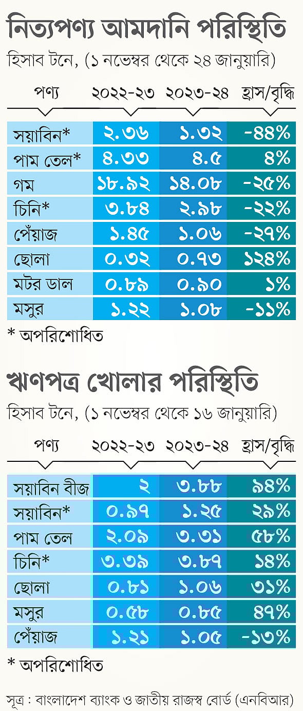 যেমন জাতীয় রাজস্ব বোর্ডের (এনবিআর) হিসাবে, গত ১ নভেম্বর থেকে ২৪ জানুয়ারি পর্যন্ত হিসাবে দেশে আগের বছরের একই সময়ের তুলনায় অপরিশোধিত সয়াবিন তেল আমদানি কমেছে ৪৪ শতাংশ (দেশে প্রবেশের হিসাব)। অন্যদিকে বাংলাদেশ ব্যাংকের হিসাবে, ১ নভেম্বর থেকে ১৬ জানুয়ারি পর্যন্ত আগের বছরের একই সময়ের তুলনায় সয়াবিন বীজ আমদানির ঋণপত্র ৯৪ শতাংশ এবং অপরিশোধিত সয়াবিন তেলের ঋণপত্র ২৯ শতাংশ বেড়েছে।