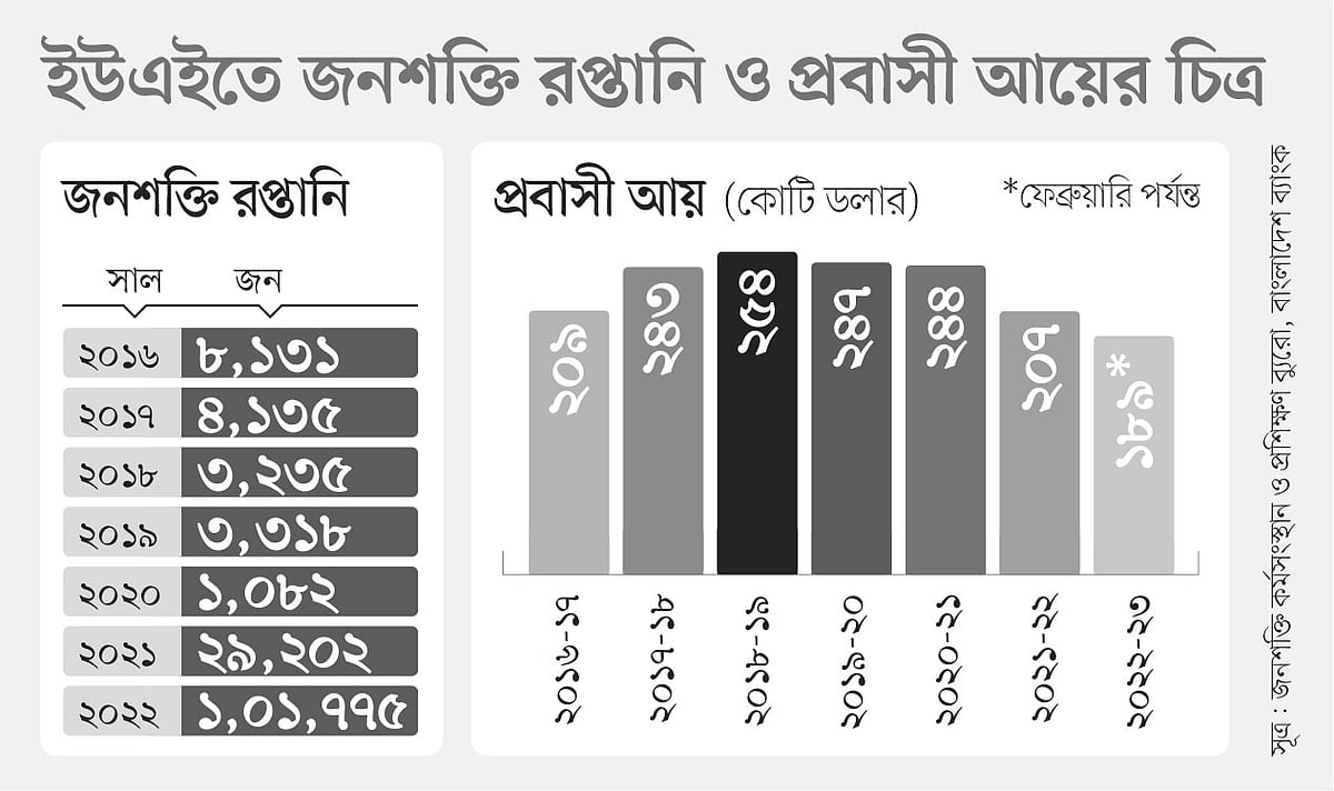 গত ১০ বছরের মধ্যে ২০২২ সালে সবচেয়ে বেশি জনশক্তি রপ্তানি হয় সংযুক্ত আরব আমিরাতে (ইউএই)। গত বছর দেশটিতে যান ১ লাখ ১ হাজার ৭৭৫ বাংলাদেশি। তবে গত ৬ অর্থবছরের মধ্যে সবচেয়ে কম ২০৭ কোটি ডলার প্রবাসী আয় আসে ২০২১-২২ অর্থবছরে। কারণ, দেশটিতে যাওয়া অনেককেই দীর্ঘ সময় বেকার থাকতে হয় কিংবা দেশে ফিরে আসতে হয়েছে। আবার অনেকে অন্য দেশে পাড়ি দিয়েছেন। ২০০০ থেকে ২০২২ সাল পর্যন্ত ইউএইতে গেছেন মোট ২১ লাখ ৪২ হাজার ৪৯৯ বাংলাদেশি।