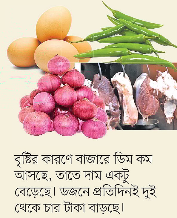 মালিবাগ বাজারের ডিম বিক্রেতা তানভীর হাসান প্রথম আলোকে বলেন, বৃষ্টির কারণে বাজারে ডিম কম আসছে, তাতে দাম একটু বেড়েছে। ডজনে প্রতিদিনই দুই থেকে চার টাকা বাড়ছে।