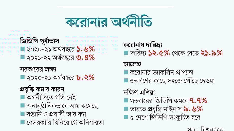 এই করোনাকালেও সরকার মোট দেশজ উৎপাদনে (জিডিপি) প্রবৃদ্ধি অর্জনের বেশ উচ্চাভিলাষী লক্ষ্য ঠিক করেছে। সরকার হয়তো মনে করছে অর্থনীতি ঘুরে দাঁড়াবে, প্রবৃদ্ধি হবে ৮ দশমিক ২ শতাংশ। কিন্তু বিশ্বব্যাংকের পূর্বাভাস বলছে ভিন্ন কথা। তাদের পূর্বাভাস সরকারের নির্ধারিত লক্ষ্যের ধারেকাছেও নেই। তারা বলছে, চলতি ২০২০-২১ অর্থবছরে বাংলাদেশের জিডিপি প্রবৃদ্ধি হতে পারে ১ দশমিক ৬ শতাংশ।