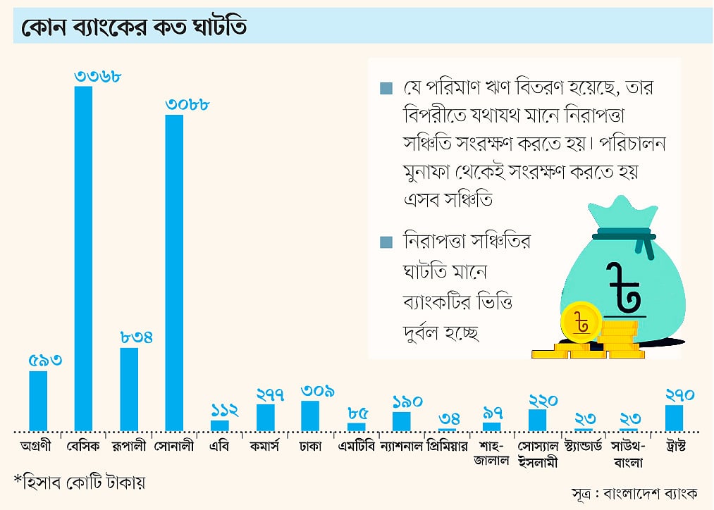 কেন্দ্রীয় ব্যাংকের প্রতিবেদনের তথ্য অনুযায়ী, রাষ্ট্রমালিকানাধীন কয়েকটি ব্যাংক বছরের পর বছর চাহিদামতো নিরাপত্তা সঞ্চিতি সংরক্ষণ করতে পারছে না। সেই সঙ্গে গত তিন বছরে বেসরকারি খাতের কয়েকটি ব্যাংকও একই সমস্যায় পড়েছে। গত ডিসেম্বর শেষে ব্যাংক খাতে মোট সঞ্চিতি ঘাটতির পরিমাণ দাঁড়িয়েছে ৬ হাজার ৬১৪ কোটি টাকায়।
